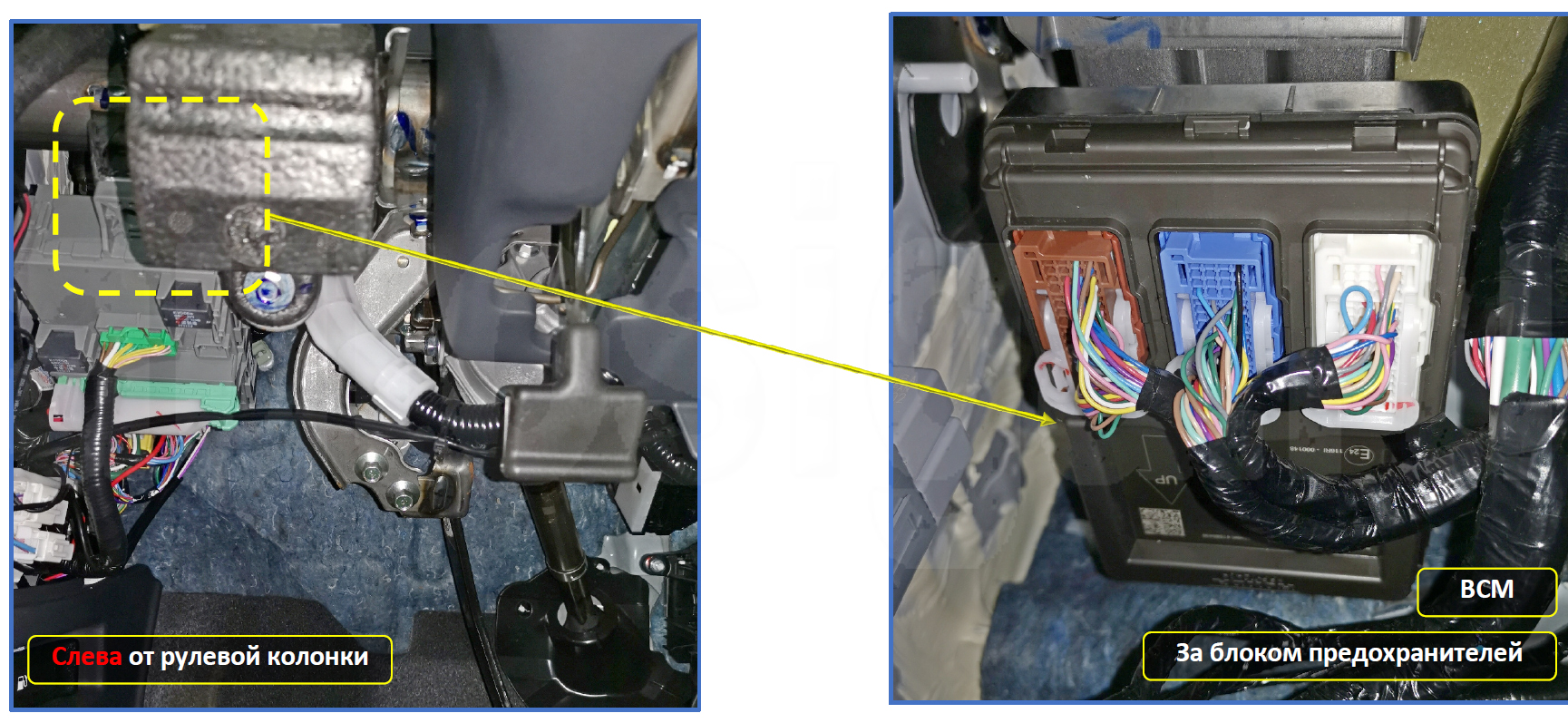 Основные подключения выполняются на блоке BCM. Блок находится слева от рулевой колонки, за блоком предохранителей.