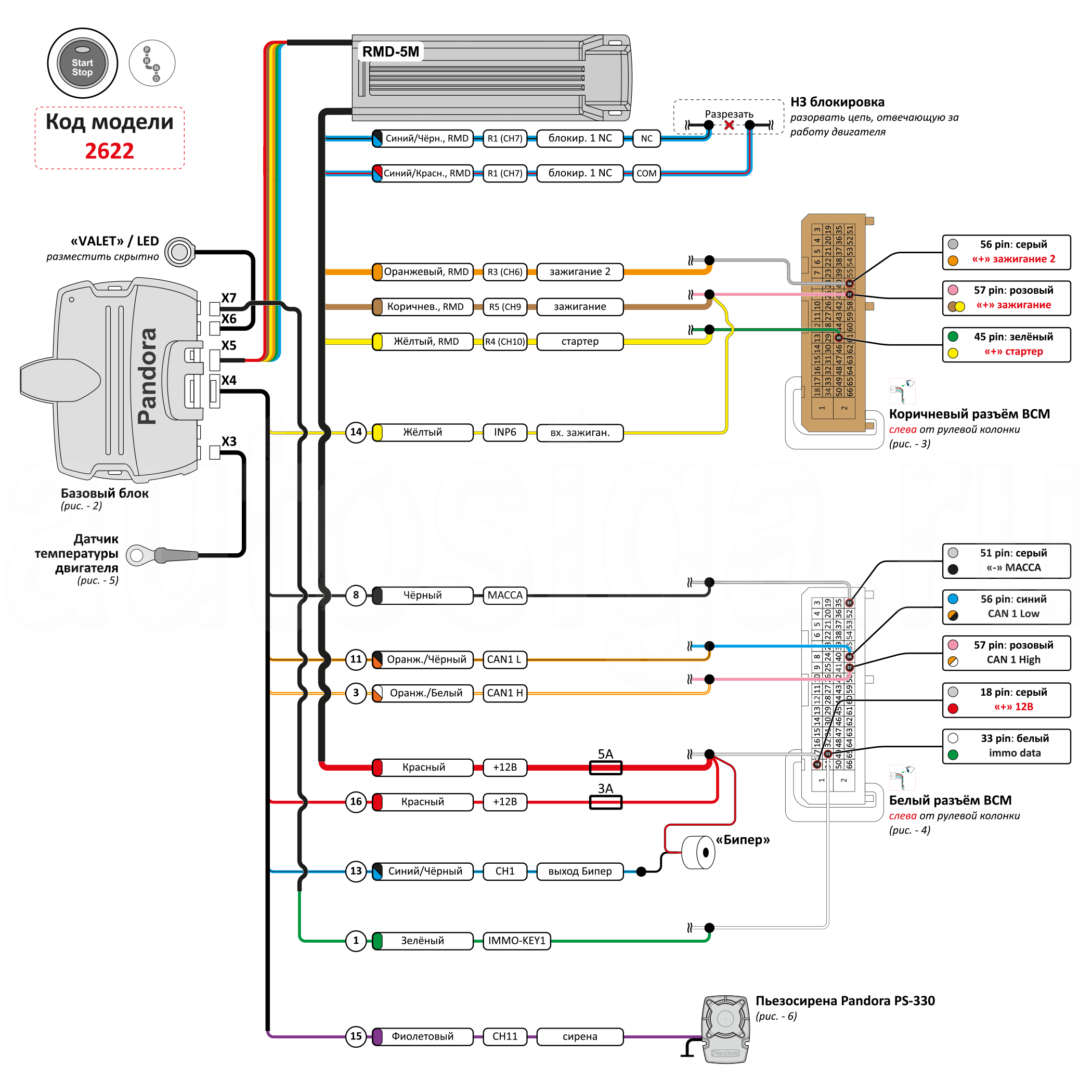 На схеме показано подключение сигнализации Pandora к цепям автомобиля.